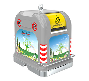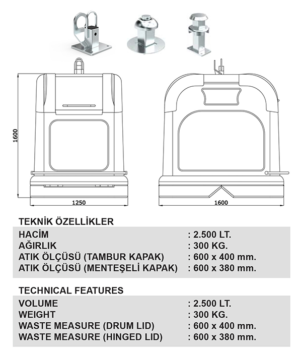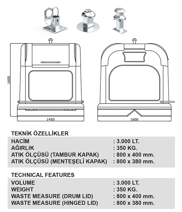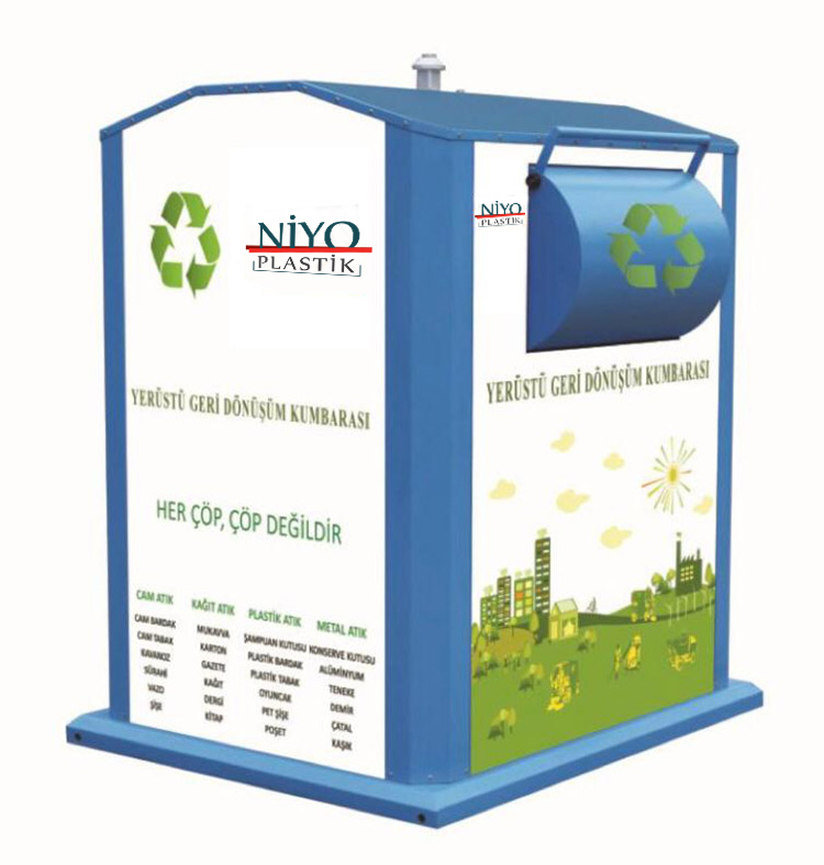 Geri dönüşüm kumbarası, atıkların kumbara içerisinden çıkartılmasını engellemek için geliştirilmiş tambur kapaklı ve yandan kapaklı sisteme sahip olacaktır. Geri dönüşüm kumbarasına ait teknik özellikler aşağıda verilmiştir.